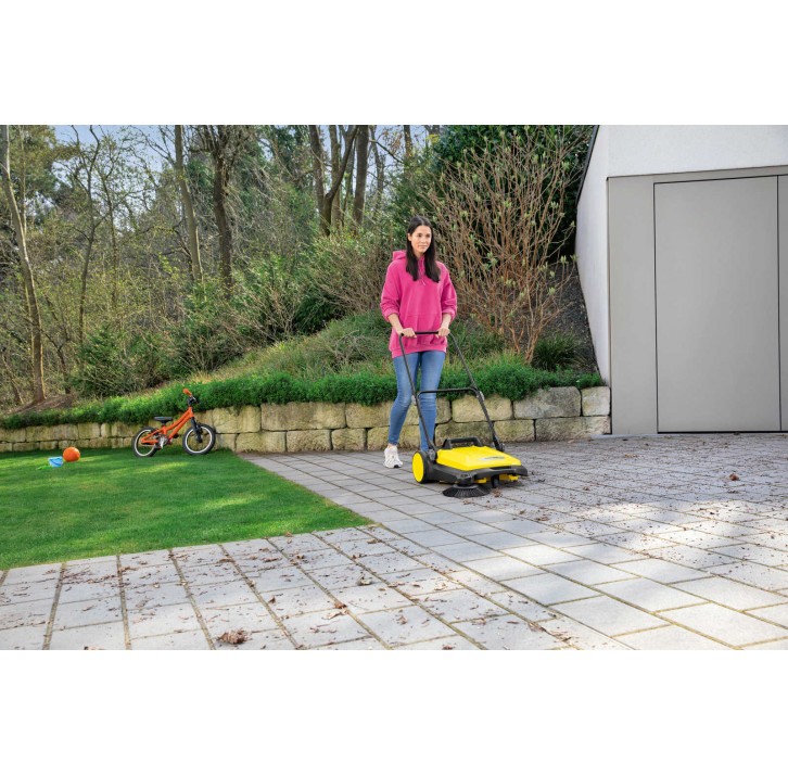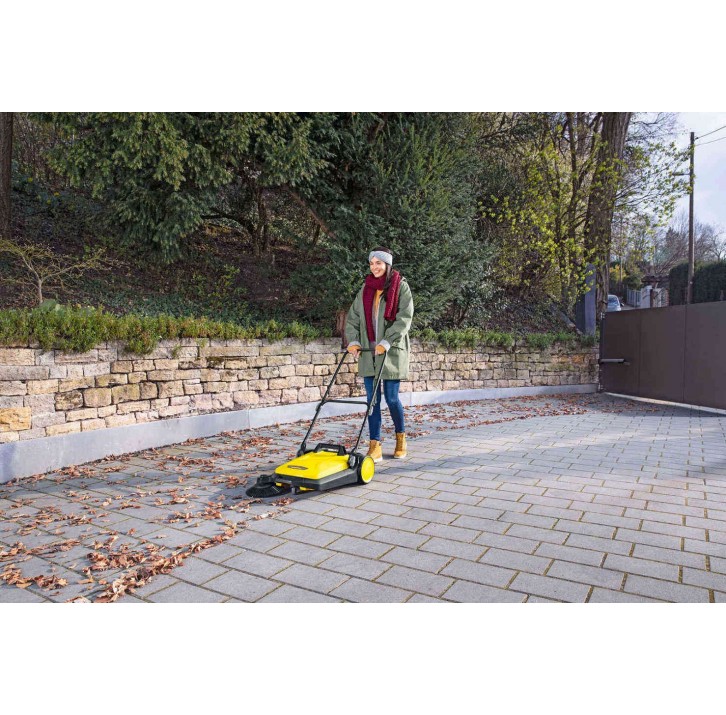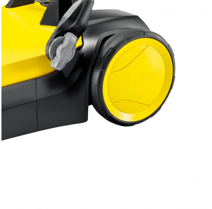 Подметальная машина Karcher S 4 для уборки малых площадей с большим контейнером (20 л) и одной боковой щеткой. Работает по принципу «совка для мусора», поэтому проста в эксплуатации. Отходящий воздух, поступающий вместе с пылью в контейнер за счет вращения щеток, проходит через фильтры пылеподавления.
