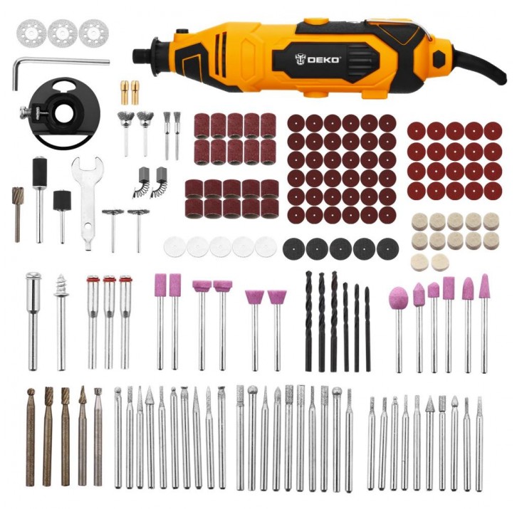 Электрический гравер с регулировкой скорости 200Вт DEKO DKRT200E идеально подходит для шлифования и полировки небольших поверхностей благодаря регулировке скорости и различным аксессуарам.