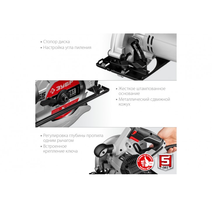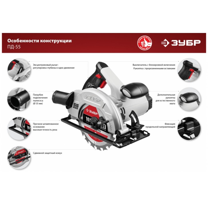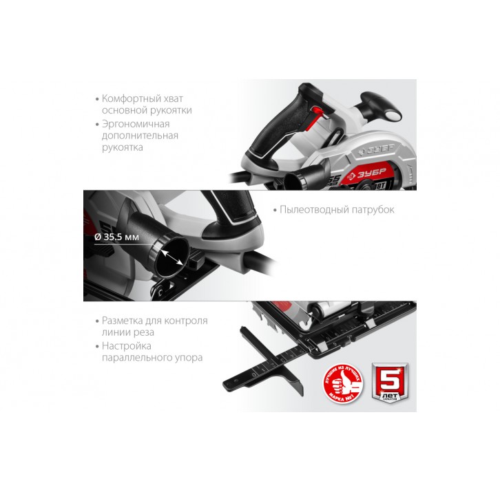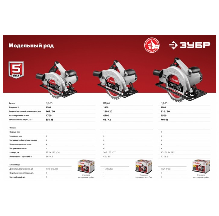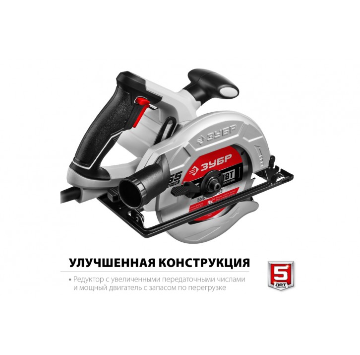 Дисковая пила ЗУБР ПД-55 предназначена для домашних мастеров.Основная и дополнительная рукоятки оснащены мягкими накладками, что обеспечивает комфортный рабочий процесс.Пилите без пыли. В корпусе есть патрубок для подключения пылесоса – это помогает сохранять чистоту в рабочей зоне.Технические характеристики Зубр ПД-55Класс товараПолупрофессиональныйМощность, Вт1300Диаметр, мм165Посадочный диаметр диска, мм20Регулировка оборотовнетMax глубина пропила под углом 90°, мм55Плавный пускнетПоддержание постоянных оборотов под нагрузкойнетНаличие патрубка для подключения пылесосаестьВозможность работы с направляющей шинойестьВес, кг3,6Габариты, мм345х255х260Число оборотов, об/мин4700Max глубина пропила под углом 45°, мм35Комплектация *Дисковая пилаДиск (установлен)НаправляющаяКлючРуководство по эксплуатацииКоробкаПараметры упакованного товараЕдиница товара: ШтукаВес, кг: 3,70Длина, мм: 380Ширина, мм: 240Высота, мм: 200ПреимуществаНезависимость от заряда батареи и, соответственно, большая производительность без просто