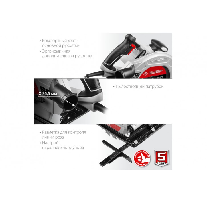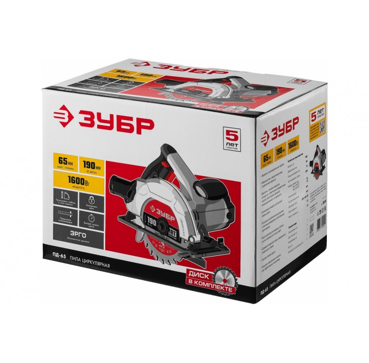 Дисковая пила ЗУБР ПД-65 предназначена для домашних мастеров.Система пылеудаления сохраняет чистоту рабочего пространства и защищает пользователя от мелкой стружки и пыли.Предусмотрены два защитных кожуха диска для предотвращения травм оператора во время работы.Технические характеристики Зубр ПД-65Класс товараПолупрофессиональныйМощность, Вт1600Диаметр, мм190Посадочный диаметр диска, мм20Регулировка оборотовнетMax глубина пропила под углом 90°, мм65Плавный пускнетПоддержание постоянных оборотов под нагрузкойнетНаличие патрубка для подключения пылесосаестьВозможность работы с направляющей шинойестьВес, кг4,2Габариты, мм345х255х260Число оборотов, об/мин4700Max глубина пропила под углом 45°, мм42Комплектация *Дисковая пилаДиск (установлен)НаправляющаяКлючРуководство по эксплуатацииКоробкаПараметры упакованного товараЕдиница товара: ШтукаВес, кг: 4,60Длина, мм: 380Ширина, мм: 270Высота, мм: 220ПреимуществаНебольшой вес, компактность и увеличенная мощностьДвигатель с запасом мощности и редуктор с увеличенным пере