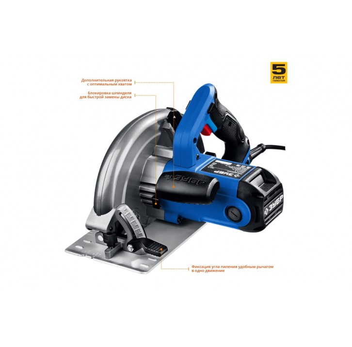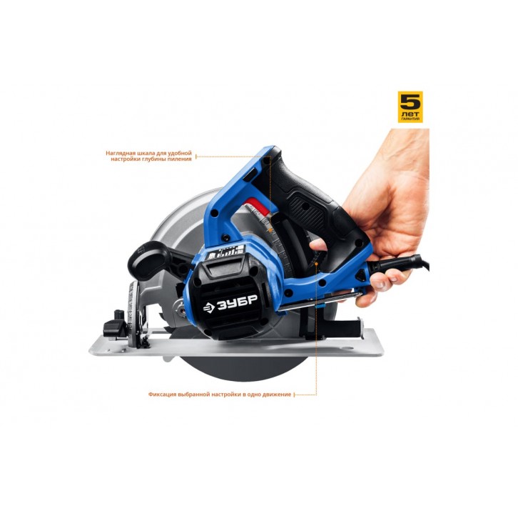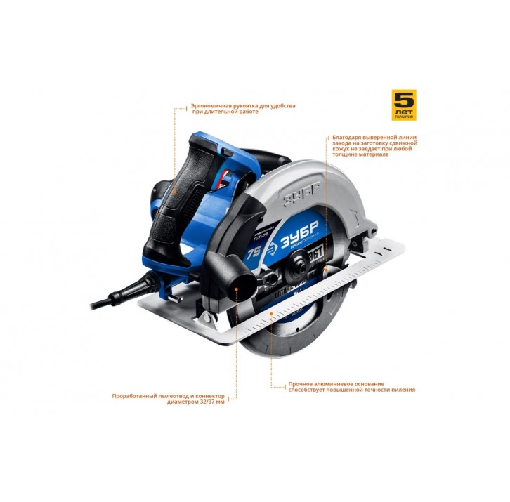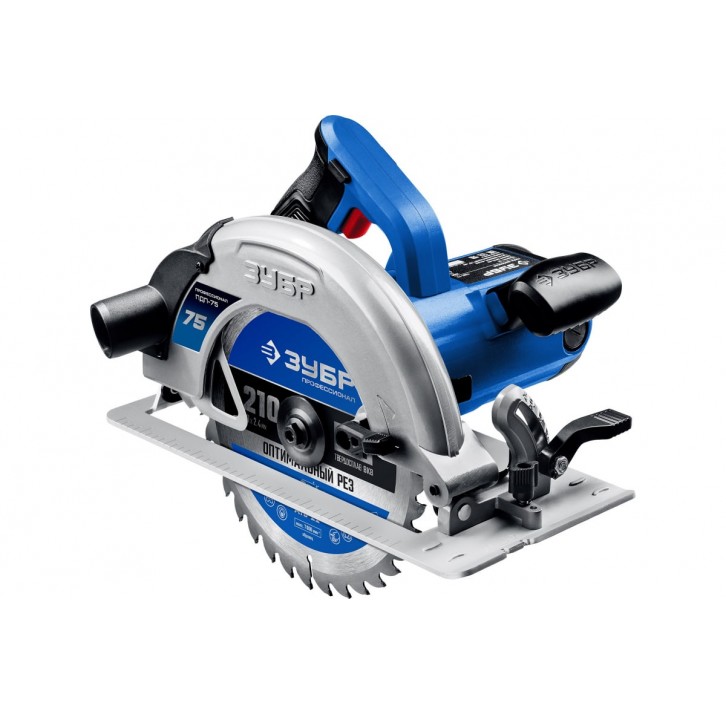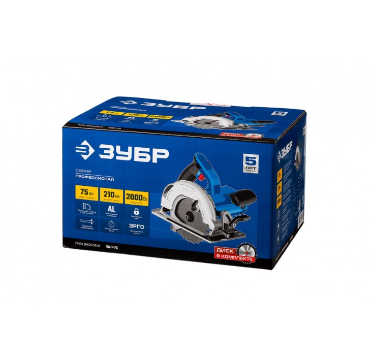Дисковая пила Зубр ПРОФЕССИОНАЛ ПДП-75 разработана для распиловочных работ по дереву. За счет небольших габаритов и малого веса отличается маневренностью и удобством пользования.Легко скользящий защитный кожух предохраняет пользователя от травм.Индикаторы линии реза под углами 90 и 45 градусов обеспечивают точное пиление по разметке.Предусмотрена возможность бесступенчатой регулировки глубины и угла пиления с удобными шкалами.Патрубок с возможностью подключения пылесоса позволяет поддерживать чистоту на рабочем месте.Благодаря блокировке шпинделя можно легко и быстро заменить пильный диск.Технические характеристики Зубр ПРОФЕССИОНАЛ ПДП-75Класс товараБытовойМощность, Вт2000Диаметр, мм210Посадочный диаметр диска, мм30Регулировка оборотовнетMax глубина пропила под углом 90°, мм75Плавный пускдаПоддержание постоянных оборотов под нагрузкойнетДлина кабеля, м3Наличие патрубка для подключения пылесосаестьВозможность работы с направляющей шинойестьВес, кг5,2Габариты, мм380x270x210Число оборотов, об/мин5300Max глубина