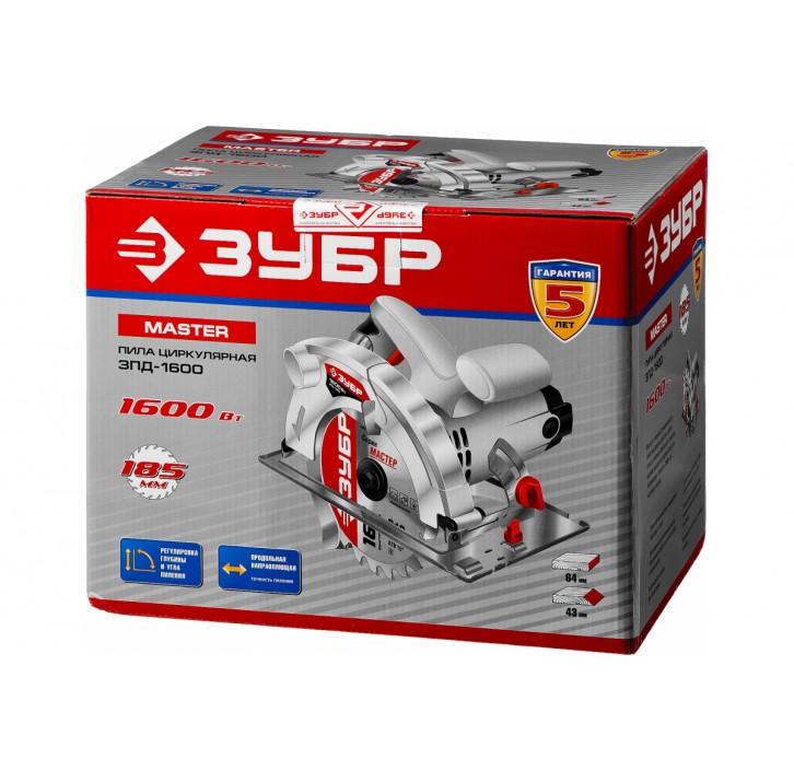 Циркулярная пила ЗУБР ЗПД-1600 оборудована электродвигателем мощностью 1600 Вт и предназначена для продольного и поперечного распиливания деревянных заготовок в домашних условиях или на верстаке. Инструмент способен распиливать древесину толщиной до 64 мм, благодаря пильному диску диаметром 185 мм. Металлический кожух редуктора обеспечивает защиту и стабильное охлаждение внутренних элементов. Предусмотрена система удаления опилок для сохранения чистоты рабочего места (патрубок под пылесос).Технические характеристики Зубр ЗПД-1600Класс товараПолупрофессиональныйМощность, Вт1600Диаметр, мм185Посадочный диаметр диска, мм20Регулировка оборотовнетMax глубина пропила под углом 90°, мм64Плавный пускнетПоддержание постоянных оборотов под нагрузкойнетДлина кабеля, м2Наличие патрубка для подключения пылесосаестьВозможность работы с направляющей шинойнетВес, кг4,1Габариты, мм350х230х180Число оборотов, об/мин4500Max глубина пропила под углом 45°, мм43Комплектация *Циркулярная пила;Пильный диск «Быстрый рез»;Ключ накидной