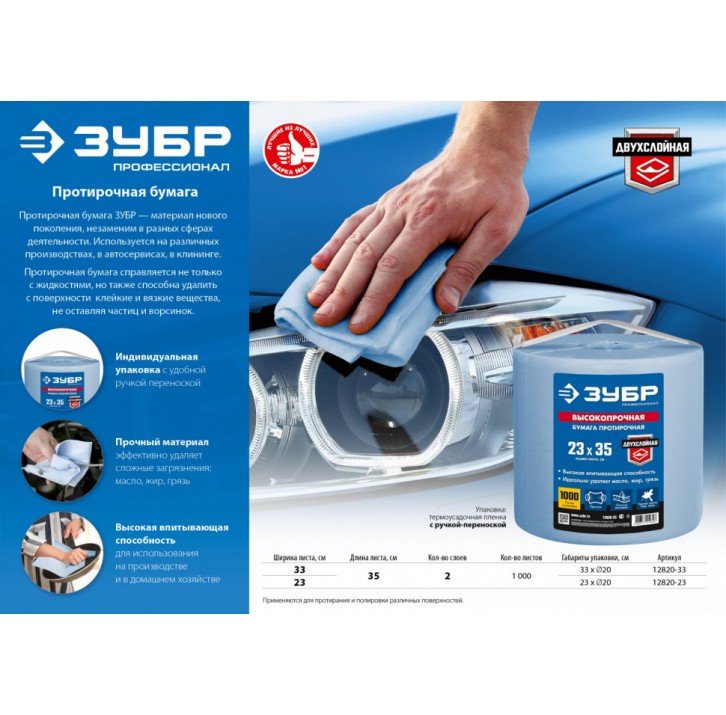 ЗУБР 33х35 см, 2х слойная в рулоне, 1000 листов, Протирочная бумага, ПРОФЕССИОНАЛ (12820-33)