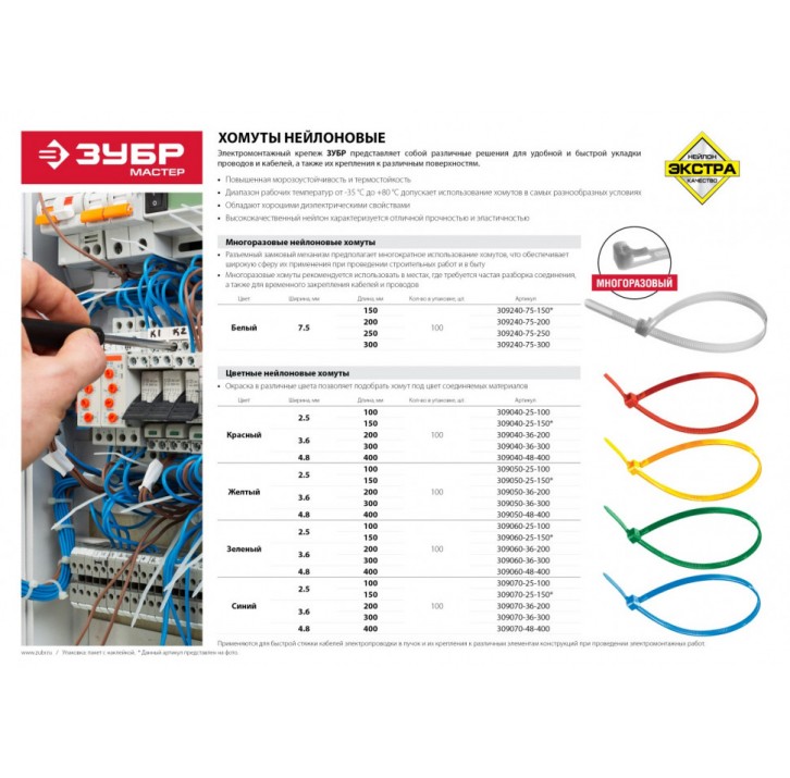 ЗУБР КС-К1 3.6 x 300 мм, нейлон РА66, кабельные стяжки красные, 100 шт, Профессионал (309040-36-300)