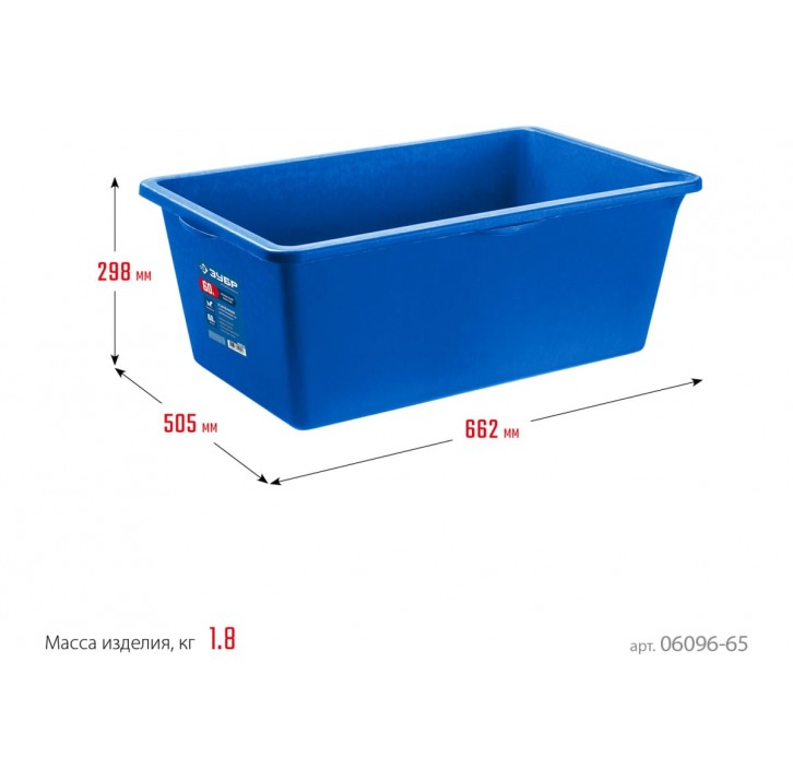 ЗУБР 60 л, первичный высокопрочный пластик, Усиленный прямоугольный строительный таз, МАСТЕР (06096-