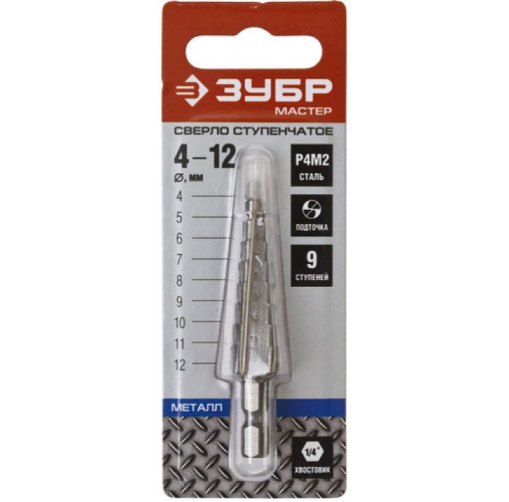 ЗУБР 4-12 мм, 9 ступеней, Р4М2 сверло ступенчатое 29665-4-12-9