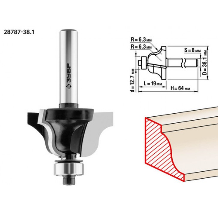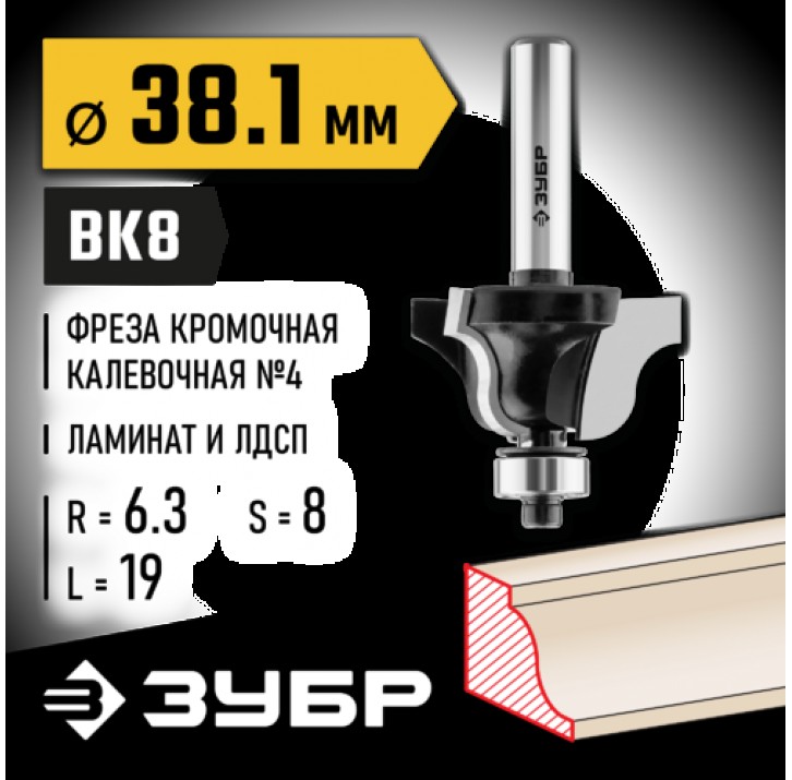ЗУБР 38.1 x 19 мм, радиус 6.3 мм, фреза кромочная калевочная №4 28787-38.1 Профессионал