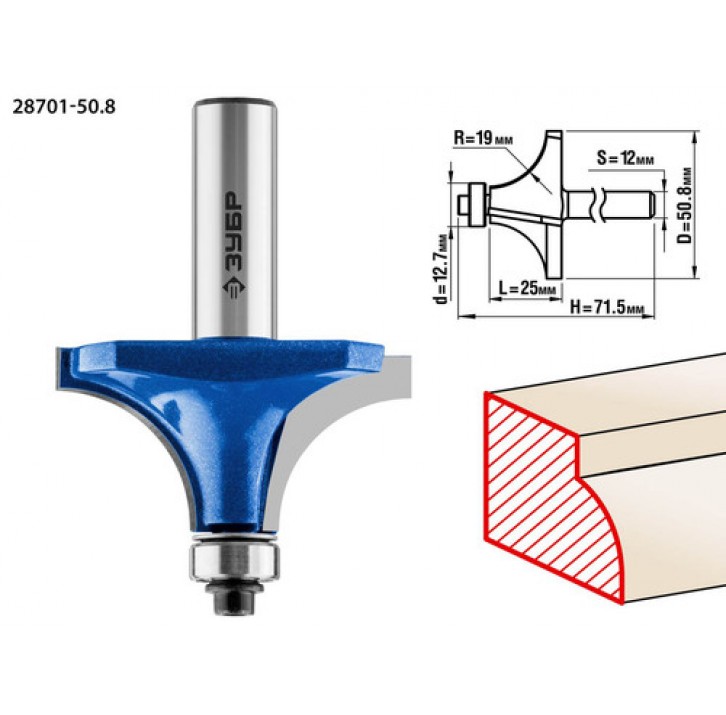ЗУБР 50.8 x 25 мм, радиус 19 мм, фреза кромочная калевочная №1 28701-50.8 Профессионал