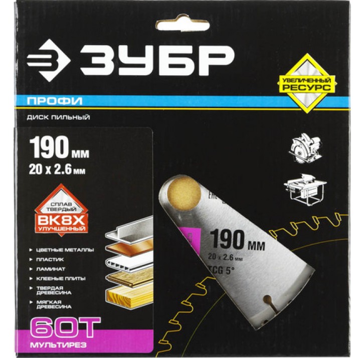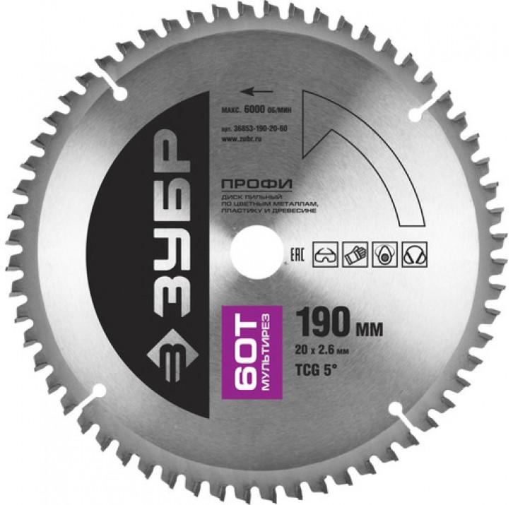 ЗУБР ф 190 х 20 мм, 60T, диск пильный по алюминию, пластику 36853-190-20-60 Профессионал
