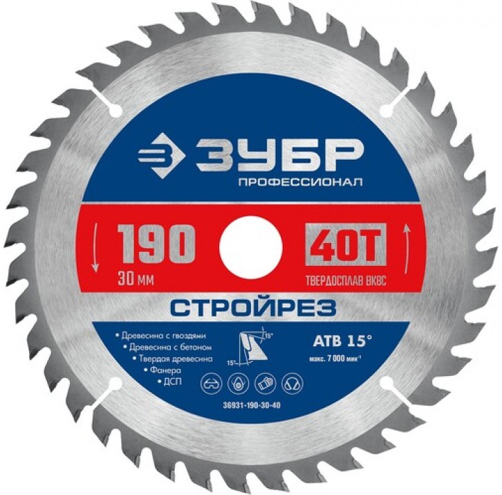 ЗУБР ф 190 х 30 мм, 40Т, диск пильный по строительной древесине 36931-190-30-40 Профессионал