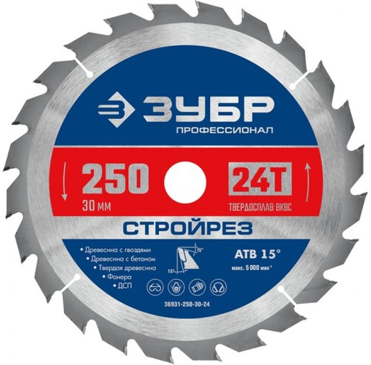 ЗУБР ф 250 х 30 мм, 24Т, диск пильный по строительной древесине 36931-250-30-24 Профессионал