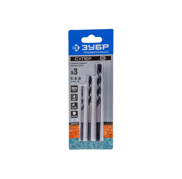 ЗУБР СУПЕР-6 3 шт: d 5-6-8 мм набор сверл по бетону с шестигранным хвостовиком ПРОФЕССИОНАЛ