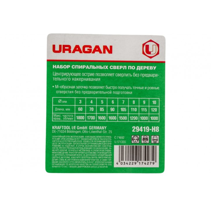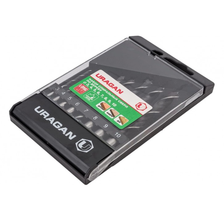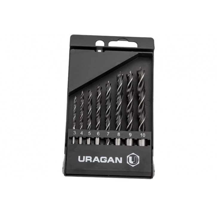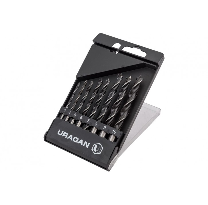URAGAN 8 шт., 3-4-5-6-7-8-9-10 мм, набор спиральных сверл по дереву