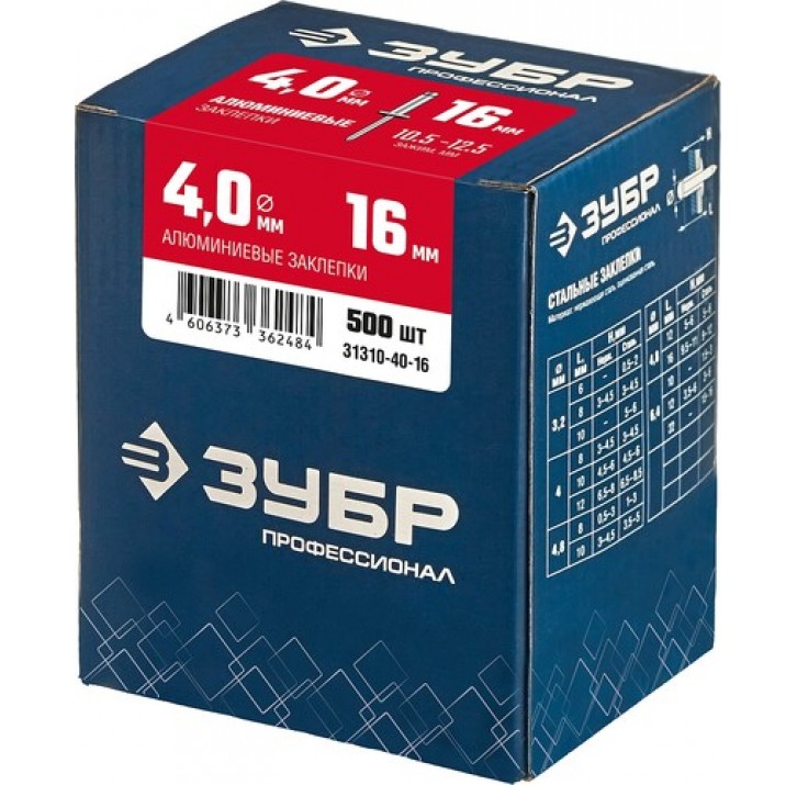 ЗУБР 4.0 х 16 мм, 500 шт., алюминиевые заклепки 31310-40-16 Профессионал
