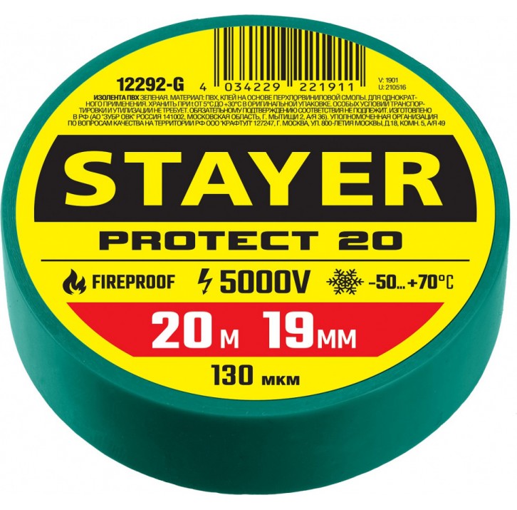 STAYER Protect-20 19 мм х 20 м зеленая, Изоляционная лента ПВХ, PROFESSIONAL (12292-G)