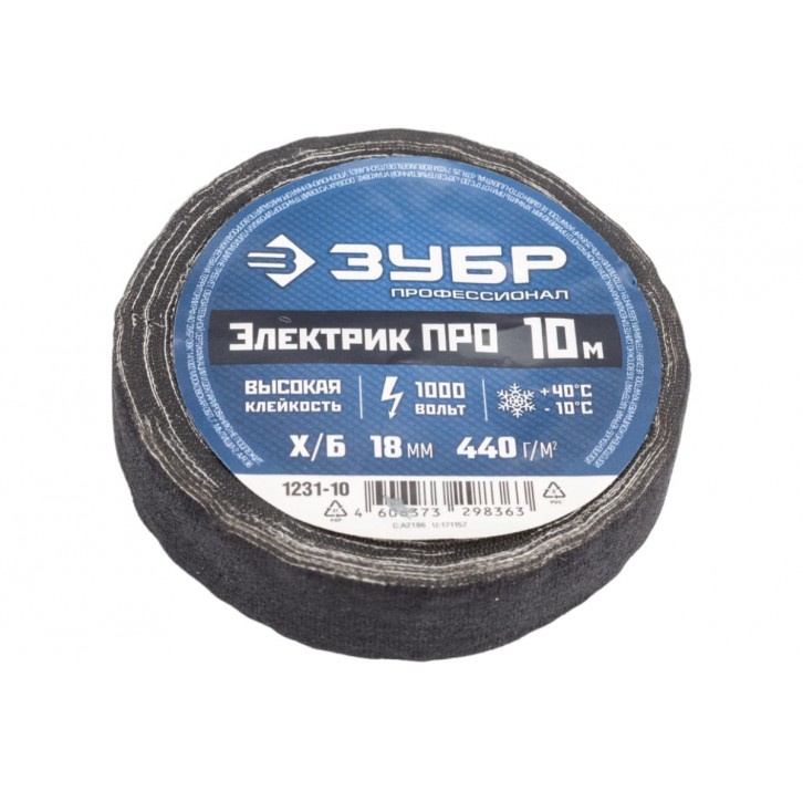 ЗУБР Электрик Про 18 мм х 10 м, черная, Изолента х/б, ПРОФЕССИОНАЛ (1231-10)