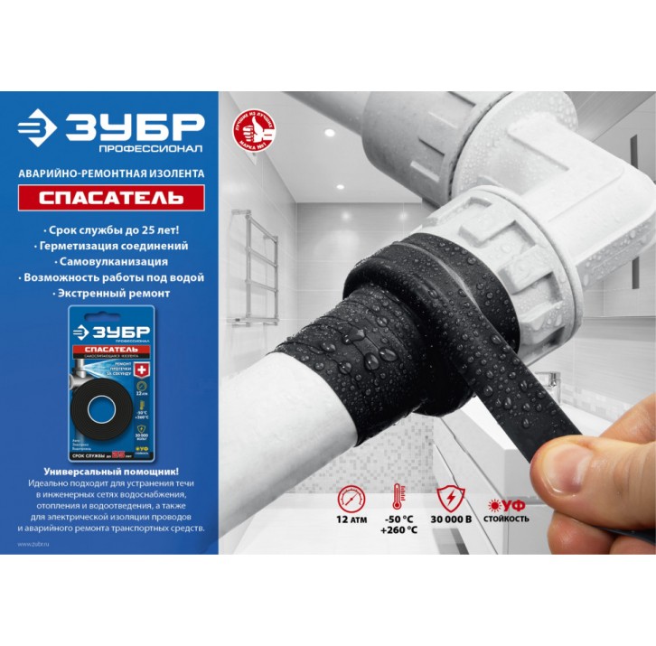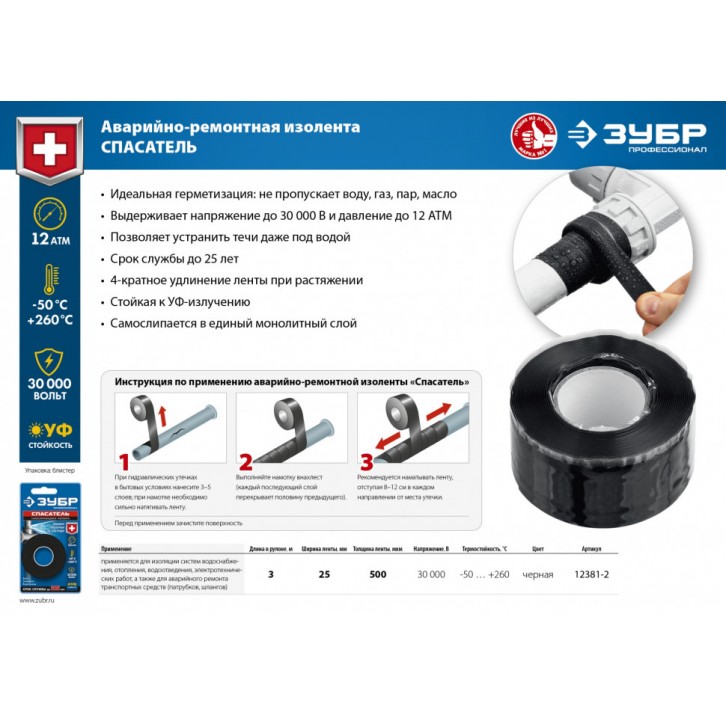 ЗУБР Силикон 3м х 25мм, 12 Атм 30 000 В черная, Самослипающаяся аварийно-ремонтная лента, ПРОФЕССИОН