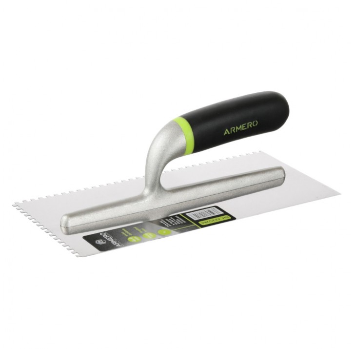 Кельма зубчатая ARMERO A231/284 с зубом предназначена для равномерного нанесения и распределения клеевого раствора на поверхность. Рабочее полотно с зеркальной полировкой изготовлено из нержавеющей стали и оснащено зубом 4 мм на 4 мм. Усиленная эргономичная двухкомпонентная рукоятка обладает одновременно легкостью и прочностью.