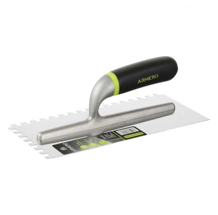 Кельма зубчатая ARMERO A231/288 с зубом предназначена для равномерного нанесения и распределения клеевого раствора на поверхность. Рабочее полотно с зеркальной полировкой изготовлено из нержавеющей стали и оснащено зубом 8 мм на 8 мм. Усиленная эргономичная двухкомпонентная рукоятка обладает одновременно легкостью и прочностью.