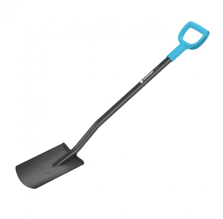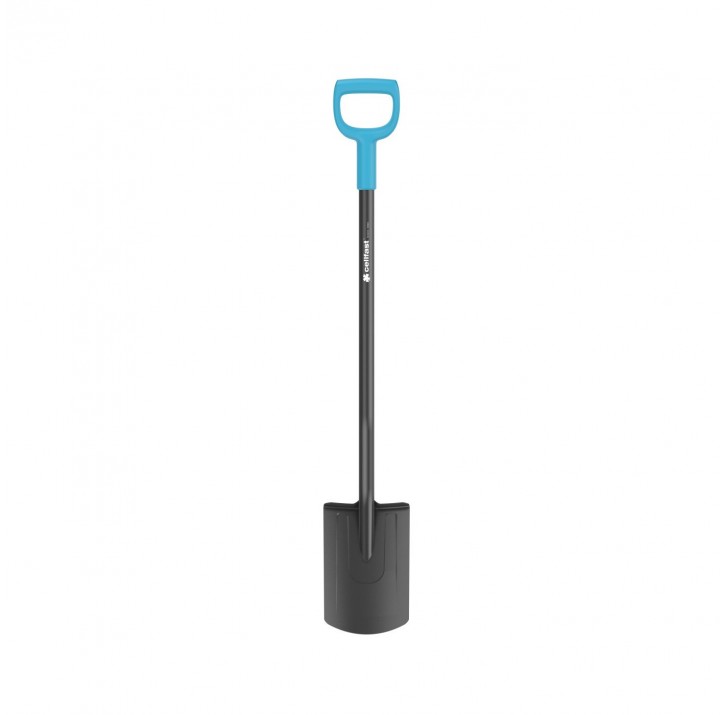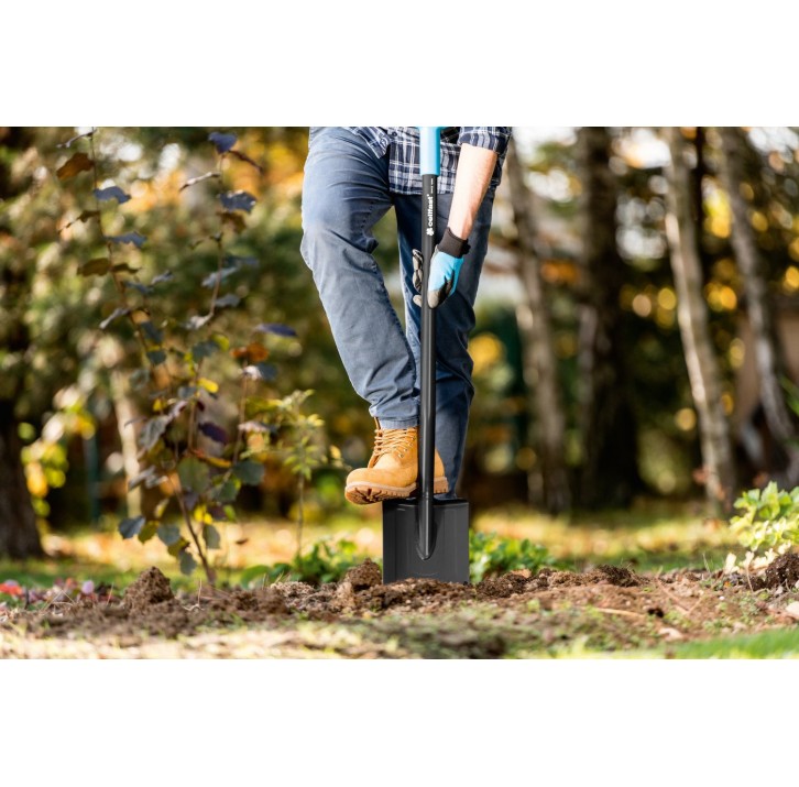 - Наконечник лопаты оборудован целостной прочной металлической подставкой для стопы, которая обеспечивает опору при вкапывании