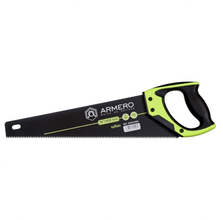 Ножовка по дереву ARMERO A532/400 c длиной полотна 400 мм с размером зубьев 9TPI (9 зубьев на дюйм). Полотно выполнено из стали SK5 толщиной 1 мм для большей жесткости с покрытием из политефлона PTFE, закаленные зубья имеют лазерную 3D заточку. Рукоятка имеет эргономичную конструкцию, выполнена из трехкомпонентного материала и закреплена на полотне с помощью винтов и ультразвуковой сварки – для оптимальной безопасности и комфорта в работе.