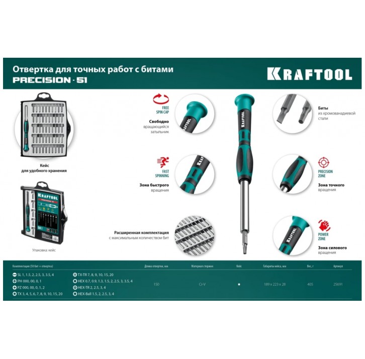 KRAFTOOL Precision-51 для точных работ 51 предм., Отвертка (25691)