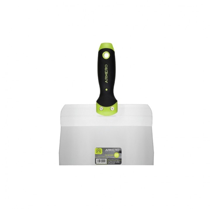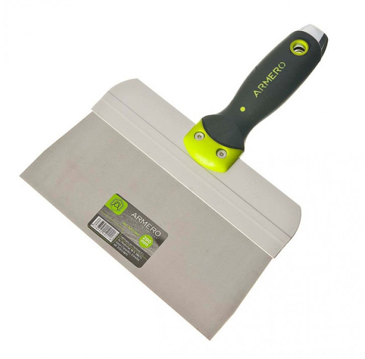 Шпатель фасадный ARMERO A211/200 с длиной полотна 200 мм и шириной полотна 80 мм с двухкомпонентной рукояткой применяется для нанесения, выравнивания и сглаживания рабочей смеси при проведении шпаклевочных работ. Полотно изготовлено из нержавеющей стали, имеет алюминиевую армирующую рамку, отлично пружинит и не подвержена коррозии при контакте с водой и строительными материалами.