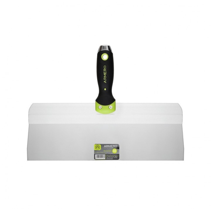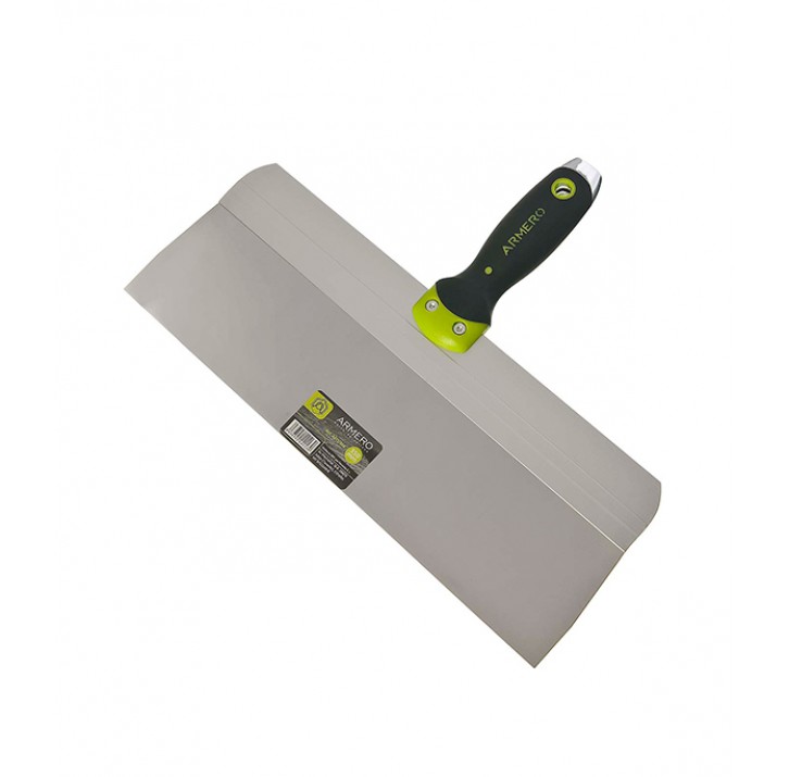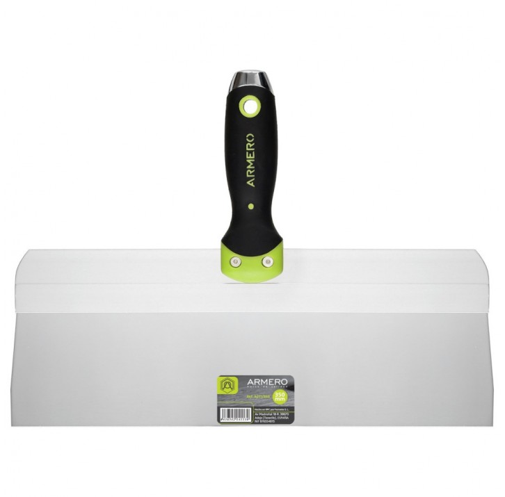 Шпатель фасадный ARMERO A211/350 с длиной полотна 350 мм и шириной полотна 80 мм с двухкомпонентной рукояткой со стальным молотком наконечником применяется для нанесения, выравнивания и сглаживания рабочей смеси при проведении шпаклевочных работ. Полотно изготовлено из нержавеющей стали, имеет алюминиевую армирующую рамку, отлично пружинит и не подвержена коррозии при контакте с водой и строительными материалами.