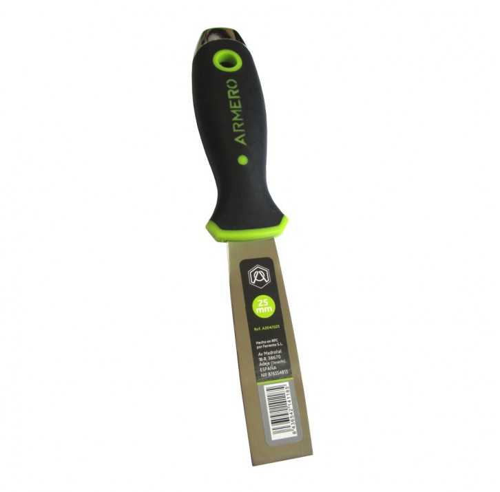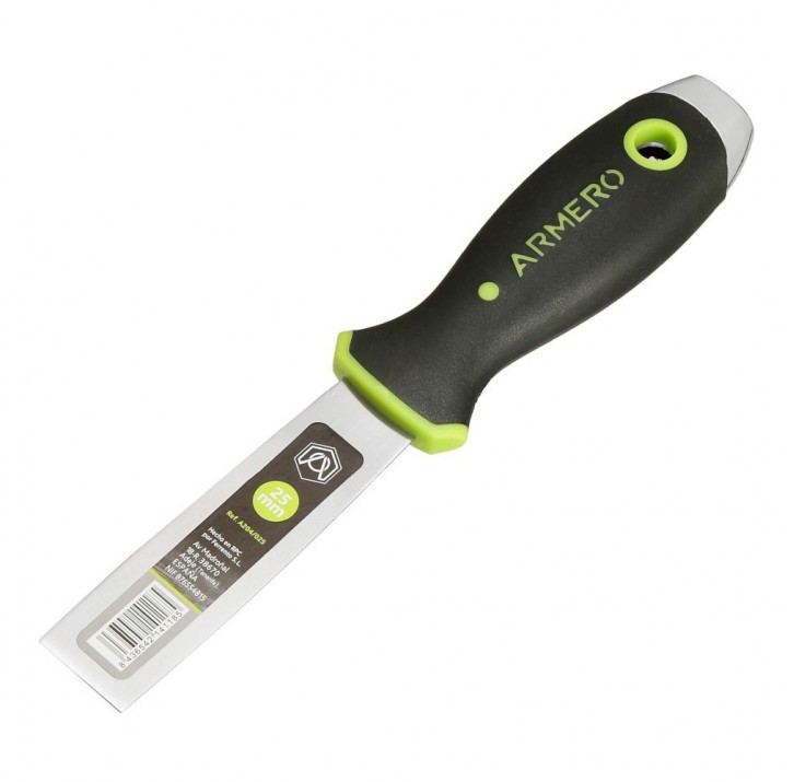 Шпатель малярный ARMERO A204/025 с шириной лезвия 25 мм используется для нанесения и распределения строительной смеси на обрабатываемую поверхность. Благодаря усиленному гибкому коническому лезвию (толщиной 1.2 мм – 0.4 мм) из нержавеющей стали инструмент отличается гибкостью и эластичностью. Шпатель гарантирует аккуратное и качественное выполнение финишных шпаклевочных работ. Двухкомпонентная эргономичная рукоятка со стальным молотком-наконечником удобно лежит в руке, обеспечивая крепкий захват.