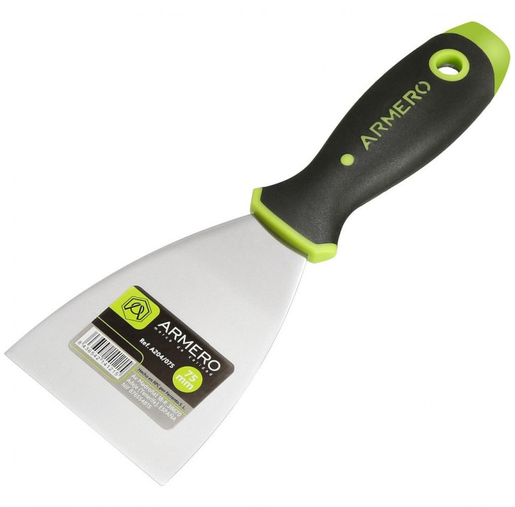 Шпатель малярный ARMERO A204/075 с шириной лезвия 75 мм используется для нанесения и распределения строительной смеси на обрабатываемую поверхность. Благодаря усиленному гибкому коническому лезвию (толщиной 1.2 мм – 0.4 мм) из нержавеющей стали инструмент отличается гибкостью и эластичностью. Шпатель гарантирует аккуратное и качественное выполнение финишных шпаклевочных работ. Двухкомпонентная эргономичная рукоятка удобно лежит в руке, обеспечивая крепкий захват.