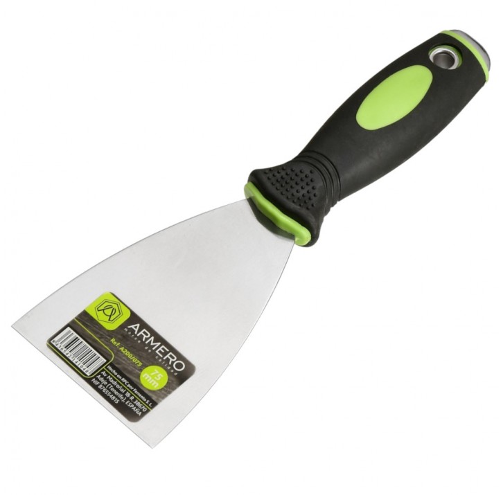 Шпатель малярный ARMERO A200/075 с шириной лезвия 75 мм используется для нанесения и распределения строительной смеси на обрабатываемую поверхность. Благодаря гибкому коническому лезвию (толщиной 0.9 мм – 0.4 мм) из нержавеющей стали инструмент отличается гибкостью и эластичностью. Шпатель гарантирует аккуратное и качественное выполнение финишных шпаклевочных работ. Двухкомпонентная эргономичная рукоятка со стальным молотком-наконечником удобно лежит в руке, обеспечивая крепкий захват.
