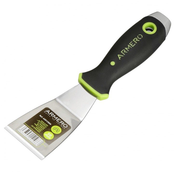 Шпатель скребок ARMERO A201/050 с шириной лезвия 50 мм может быть использован для быстрой очистки различных поверхностей от износившихся лакокрасочных покрытий и для монтажа натяжных потолков Инструмент имеет жесткое изогнутое лезвие из нержавеющей стали толщиной 1.2 мм. Мягкая двухкомпонентная эргономичная рукоятка удобно лежит в руке, обеспечивая крепкий захват.