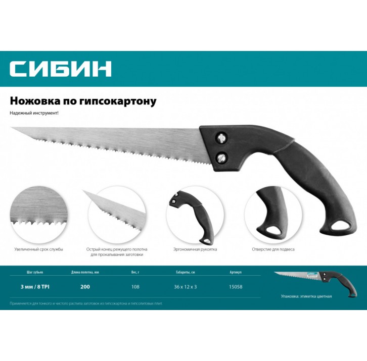 СИБИН 200 мм, шаг 8 TPI (3 мм), Выкружная ножовка по гипсокартону (15058)