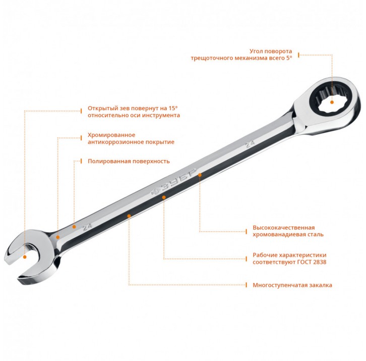 ЗУБР 24 мм, Комбинированный трещоточный гаечный ключ, Профессионал (27074-24)