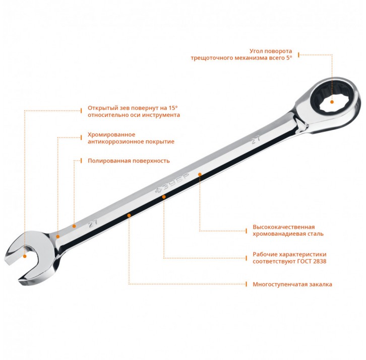 ЗУБР 27 мм, Комбинированный трещоточный гаечный ключ, Профессионал (27074-27)