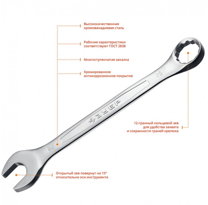 ЗУБР 32 мм, Комбинированный гаечный ключ, Профессионал (27087-32)