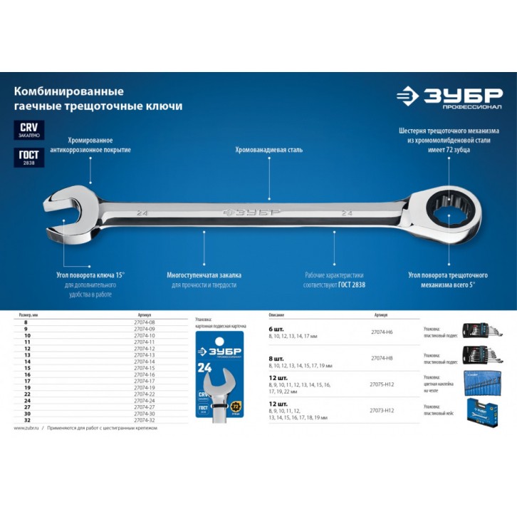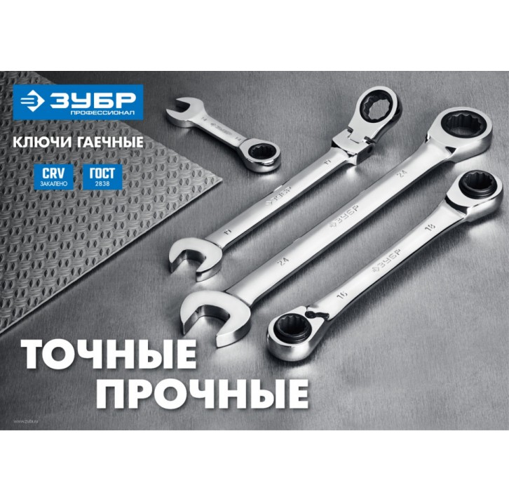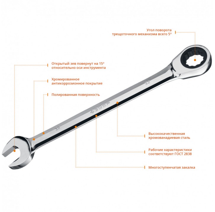 ЗУБР 32 мм, Комбинированный трещоточный гаечный ключ, Профессионал (27074-32)