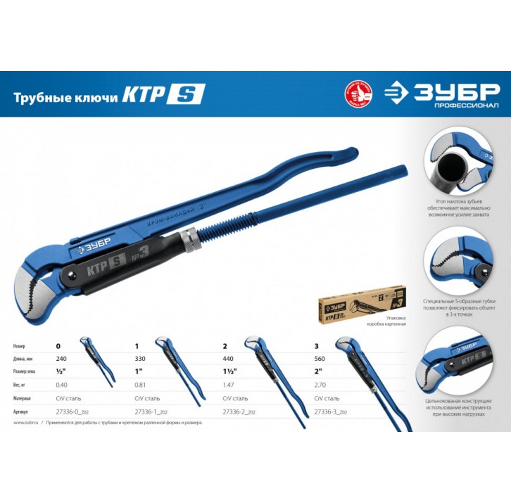 ЗУБР №1, 1″, 330 мм, Трубный ключ с изогнутыми губками ТИП ″У″, Профессионал (27336-1)