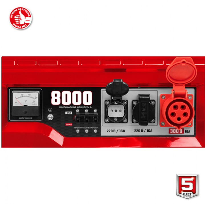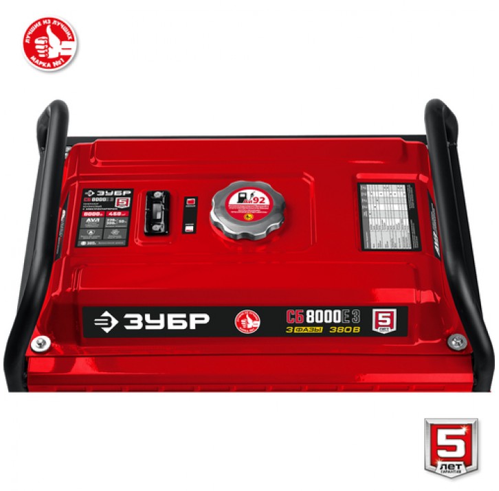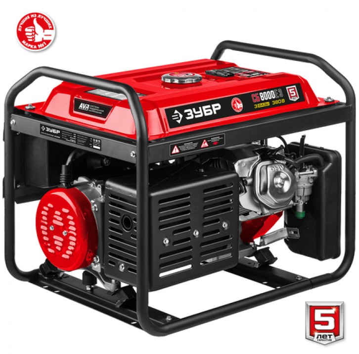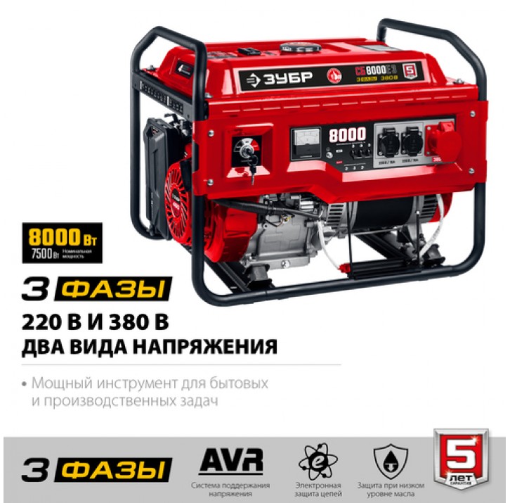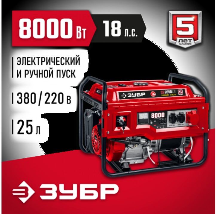 ЗУБР 8 кВт, трехфазный, синхронный, щеточный, с электростартером, бензиновый генератор СБ-8000Е-3 Ма
