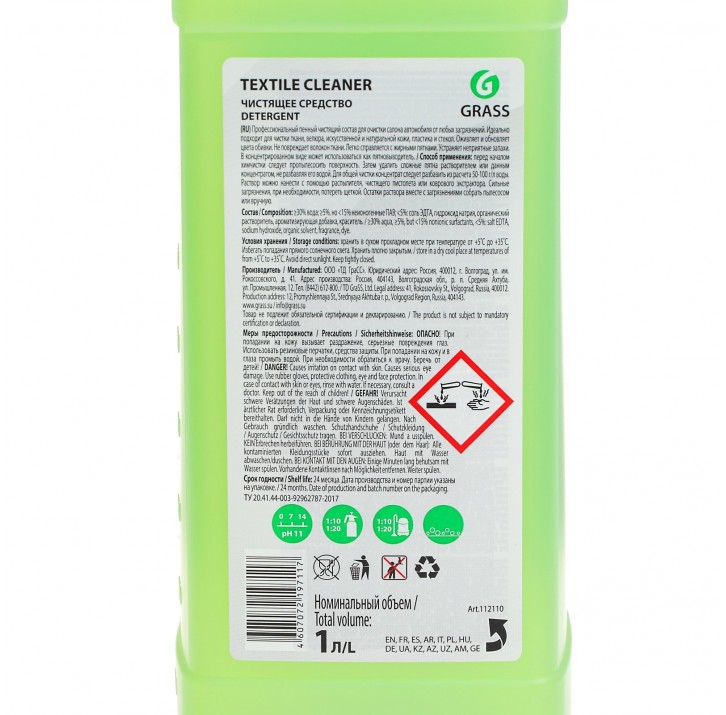 Профессиональный низкопенный моющий состав GRASS "TEXTYLE CLEANER" для очистки салона автомобиля от любых загрязнений. Идеально подходит для чистки ткани, велюра, искусственной и натуральной кожи, пластика и стекол. Оживляет и обновляет цвета обивки. Не повреждает волокон ткани. Легко справляется с жирными пятнами. Устраняет неприятные запахи. В концентрированном виде может использоваться как пятновыводитель. Подходит для уборки с помощью моющего пылесоса (экстрактора).