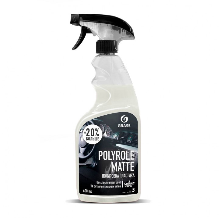 Профессиональный матовый полироль Grass «Polyrole Matte» для обработки приборных панелей, неокрашенных бамперов, покрышек, для очистки и полировки изделий из кожи, дерева винила, пластика и резины, не оставляет жирных пятен, препятствует оседанию пыли придает матовый блеск, обладает приятным ароматом.